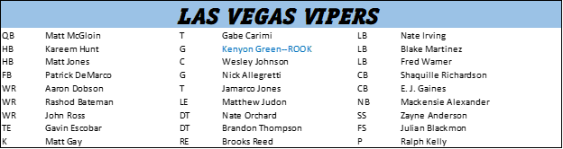 On defense, the best day among the free agent defenders belongs to former San Diego LB Myles Jack, now plying his trade for the Dallas Roughnecks. Jack finished his opener, a 27-20 win in Las Vegas, with 7 tackles, 1 for loss and 1 sack, forcing a fumble along the way. Other defensive starters included Budda Baker (HOU to ARZ) with 4 tackles, and corner Dee Milliner (ORL to WSH) with 8.